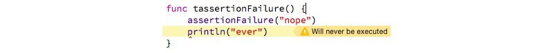 assertionFailure() 는 **assert()**함수와 비슷한 이름을 가지고 있지만, 혼동하기 힘든 함수입니다. 어떤 특정한 상황에 대해 반드시 예외를 발생시켜야하는 경우 사용합니다. assertionFailure() 의 가장 큰 특징은 이 함수를 사용한 if문이나 함수등의 구조의 종료시점에 @noreturn과 같은 효과를 내준다는 것입니다. debug mode에서 어플리케이션은 예외를 발생하고 종료하지만, release mode에서는 @noreturn효과는 그대로 유지하고 함수 예외 발생만 생략합니다. 그렇기 때문에 컴파일러는 아래와 같은 경고를 사용자에게 계속 알려줍니다.